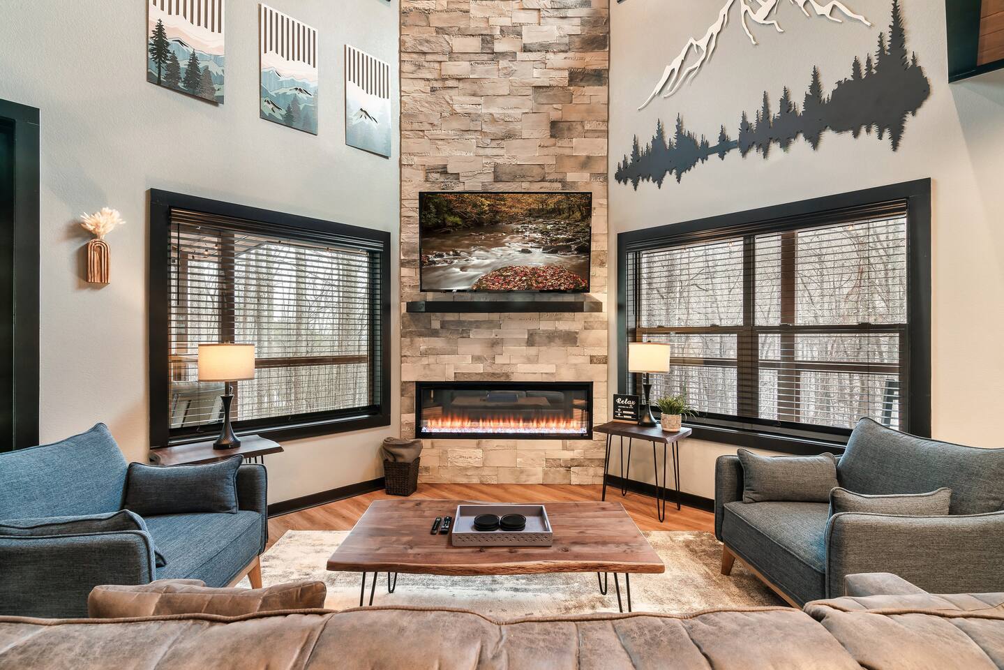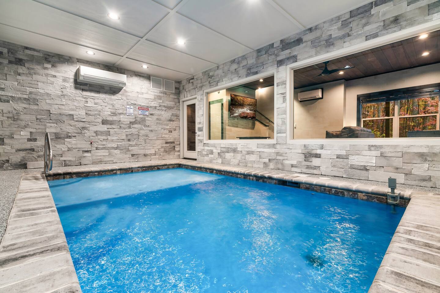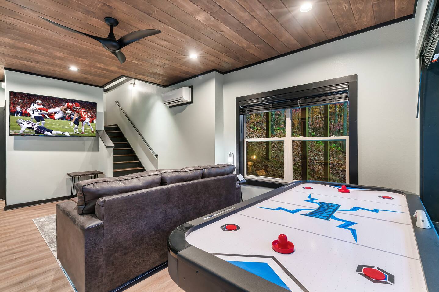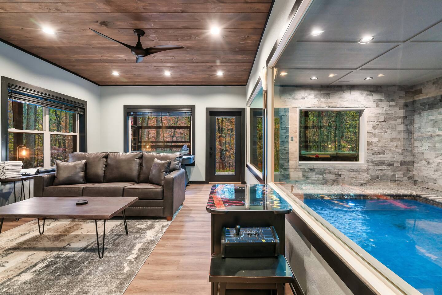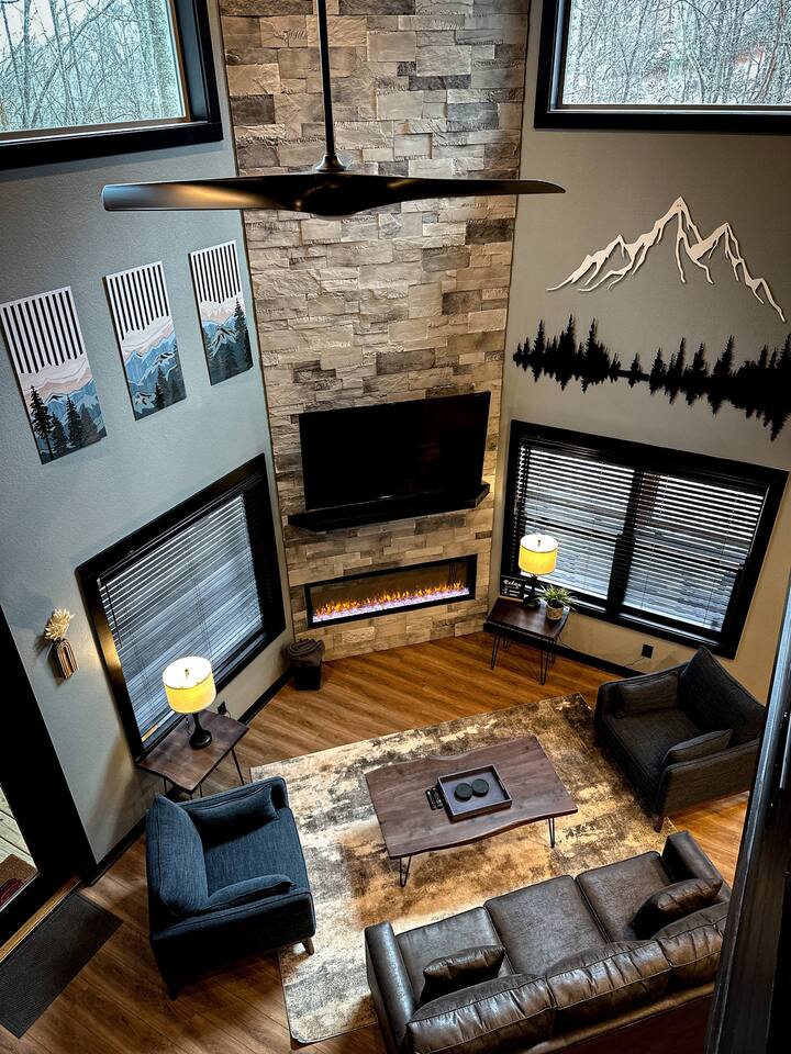 Welcome to Bluff Mountain Retreat - Our newly constructed modern cabin, nestled on a serene 2-acre wooded lot in Sevierville, Tennessee. Located less than 5 miles from the heart of Pigeon Forge, this retreat strikes the perfect balance—close enough to enjoy all the action, yet far enough away to provide a peaceful, quiet escape. The cabin features three spacious bedrooms, each with king beds and en suite baths. The main level bedroom is designed for accessibility, making it suitable for everyone. Additionally, there are two pull-out sofas, one on the main floor and one on the bottom floor, conveniently located next to the air hockey game and arcade game table, providing extra sleeping space and entertainment options. A spacious laundry room is conveniently located on the top level. Enjoy the indoor pool on the bottom level and unwind in the outdoor hot tub, which is situated near the fire pit. The outdoor living area offers a cozy setting for relaxation with its owner fireplace and big screen TV. The cabin is equipped with six smart televisions located throughout the house for your entertainment needs. The property includes Wi-Fi to keep you connected during your stay. For added convenience, the cabin features an electric vehicle charger and is just 6 miles from Kroger and Publix grocery stores. The nearest gas station and Whaley's Country Store are both located just 2.5 miles away, making it easy to meet any additional needs during your visit. Large windows in every room allow natural light to fill the space and offer stunning views of the beautiful surroundings. Whether you are looking to explore the Great Smoky Mountains or simply relax in a tranquil setting, our cabin is the ideal destination for your next getaway. *10 miles to Dollywood *6 miles to The Island In Pigeon Forge *7 miles to The Titanic Museum In Pigeon Forge *12.5 miles to the Gatlinburg Welcome Center *15 miles to Anakeesta *15 miles to Ripley's Aquarium of the Smokies *17 Miles to Ober Mountain - Large, heated indoor pool with giant Baja Shelf for kids to play - Brand new, 4-person hot tub - Real wood-burning fireplace outside and electric fireplace inside - Giant, wood-burning fire pit just off the lower deck We can't wait for you to call Bluff Mountain Retreat home!
