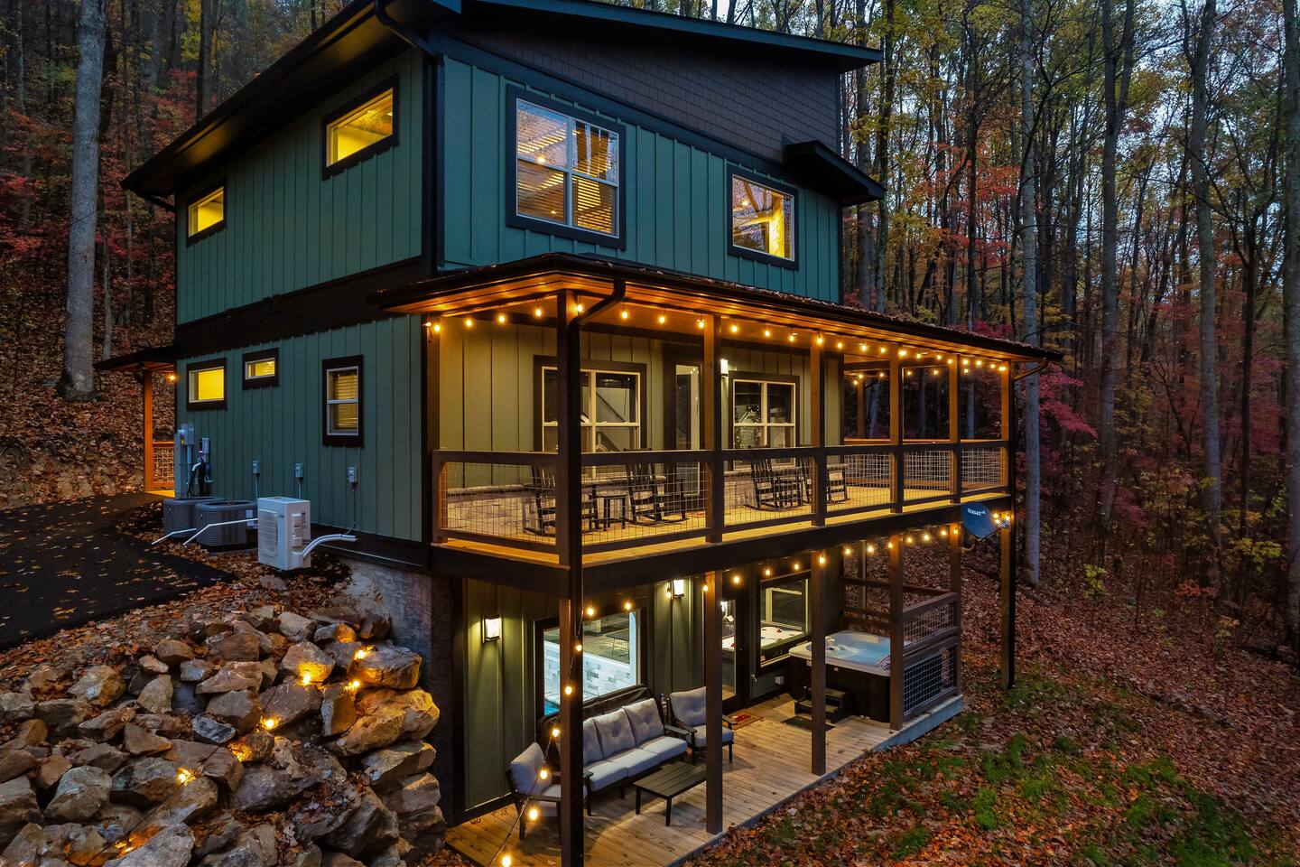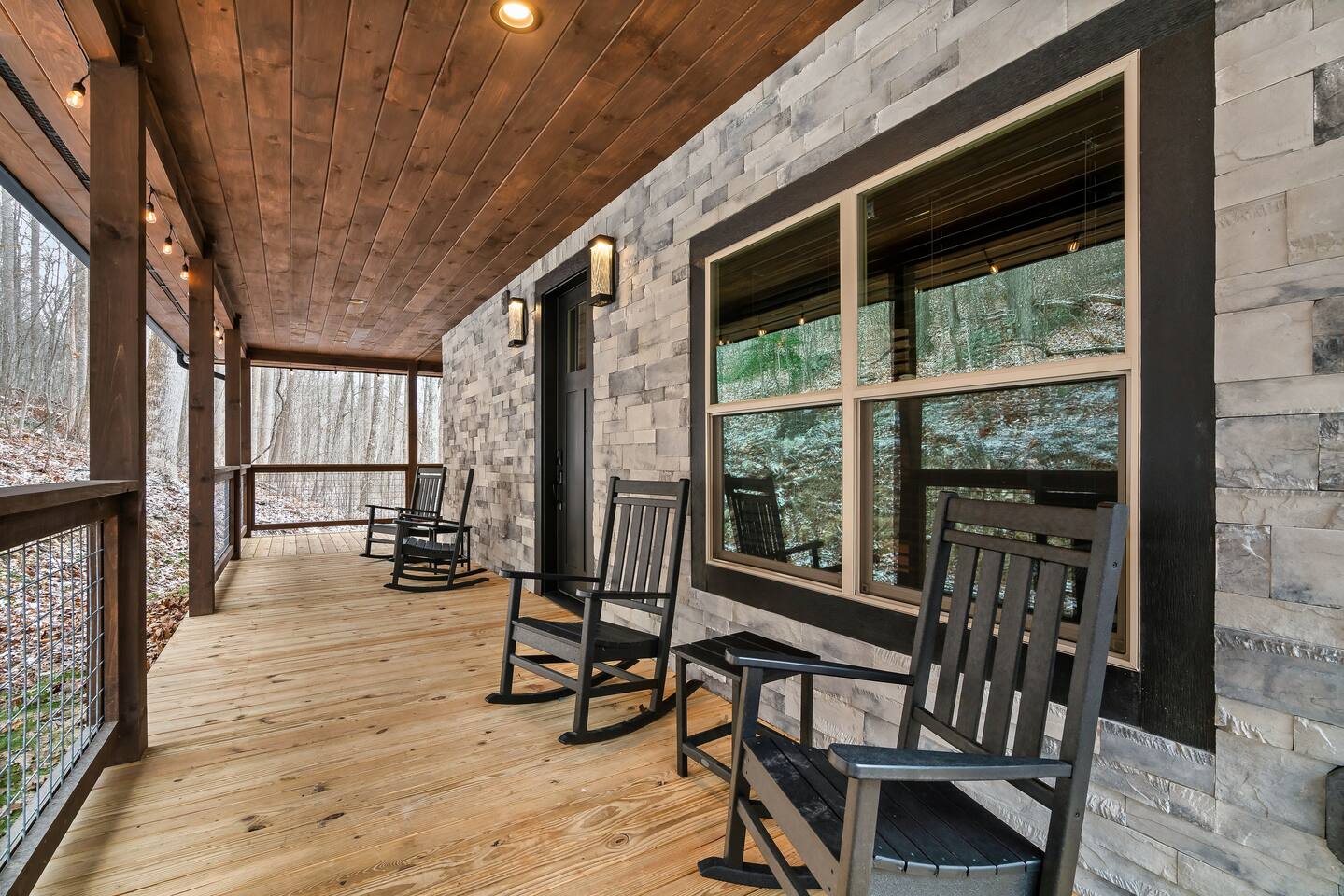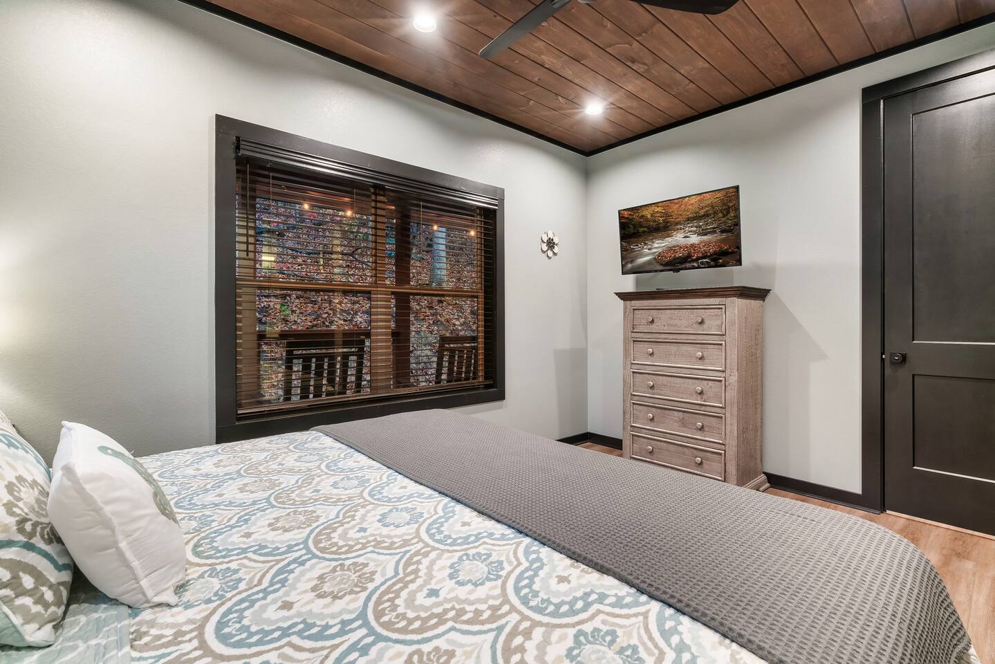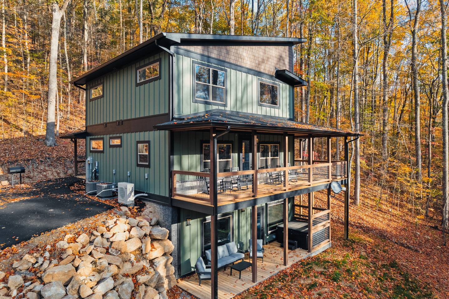 Welcome to Bluff Mountain Retreat - Our newly constructed modern cabin, nestled on a serene 2-acre wooded lot in Sevierville, Tennessee. Located less than 5 miles from the heart of Pigeon Forge, this retreat strikes the perfect balance—close enough to enjoy all the action, yet far enough away to provide a peaceful, quiet escape. The cabin features three spacious bedrooms, each with king beds and en suite baths. The main level bedroom is designed for accessibility, making it suitable for everyone. Additionally, there are two pull-out sofas, one on the main floor and one on the bottom floor, conveniently located next to the air hockey game and arcade game table, providing extra sleeping space and entertainment options. A spacious laundry room is conveniently located on the top level. Enjoy the indoor pool on the bottom level and unwind in the outdoor hot tub, which is situated near the fire pit. The outdoor living area offers a cozy setting for relaxation with its owner fireplace and big screen TV. The cabin is equipped with six smart televisions located throughout the house for your entertainment needs. The property includes Wi-Fi to keep you connected during your stay. For added convenience, the cabin features an electric vehicle charger and is just 6 miles from Kroger and Publix grocery stores. The nearest gas station and Whaley's Country Store are both located just 2.5 miles away, making it easy to meet any additional needs during your visit. Large windows in every room allow natural light to fill the space and offer stunning views of the beautiful surroundings. Whether you are looking to explore the Great Smoky Mountains or simply relax in a tranquil setting, our cabin is the ideal destination for your next getaway. *10 miles to Dollywood *6 miles to The Island In Pigeon Forge *7 miles to The Titanic Museum In Pigeon Forge *12.5 miles to the Gatlinburg Welcome Center *15 miles to Anakeesta *15 miles to Ripley's Aquarium of the Smokies *17 Miles to Ober Mountain - Large, heated indoor pool with giant Baja Shelf for kids to play - Brand new, 4-person hot tub - Real wood-burning fireplace outside and electric fireplace inside - Giant, wood-burning fire pit just off the lower deck We can't wait for you to call Bluff Mountain Retreat home!