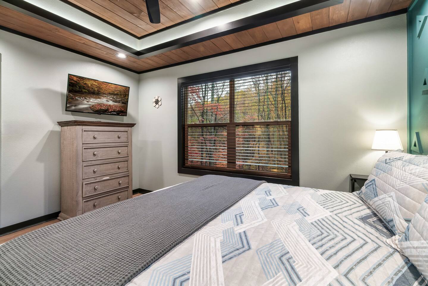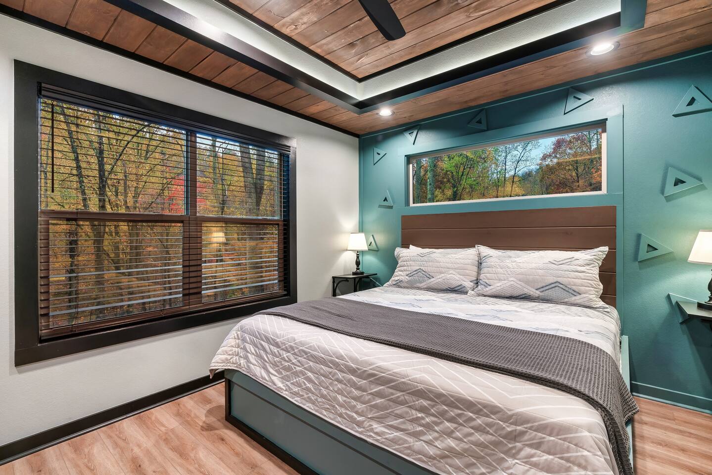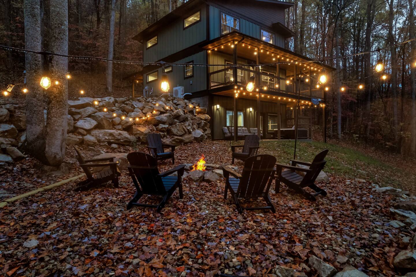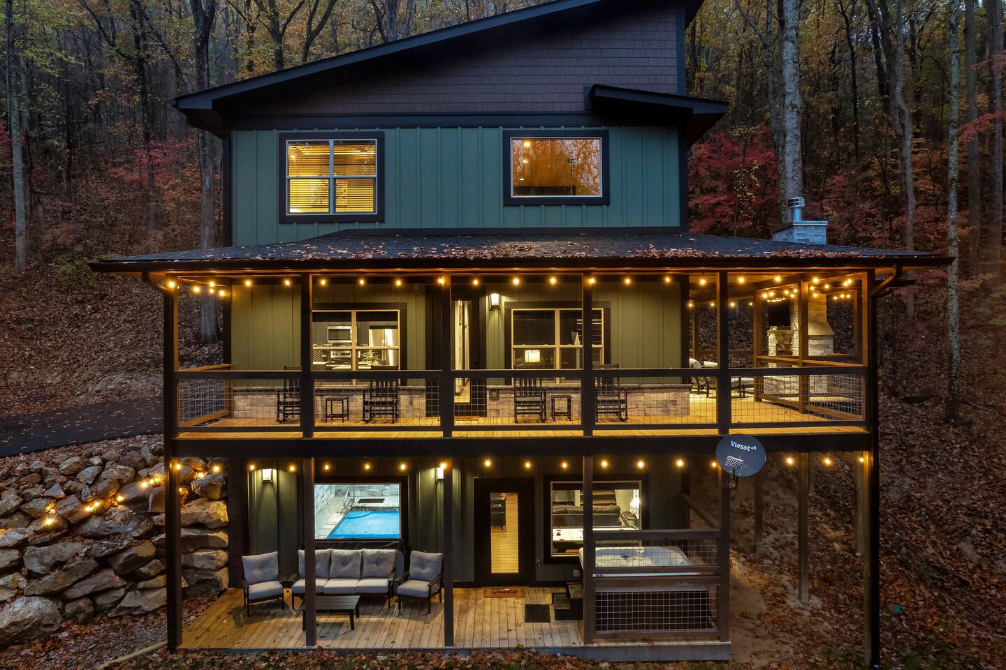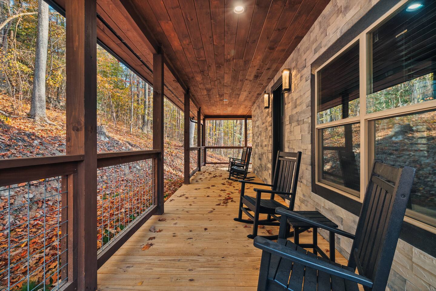 Welcome to Bluff Mountain Retreat - Our newly constructed modern cabin, nestled on a serene 2-acre wooded lot in Sevierville, Tennessee. Located less than 5 miles from the heart of Pigeon Forge, this retreat strikes the perfect balance—close enough to enjoy all the action, yet far enough away to provide a peaceful, quiet escape. The cabin features three spacious bedrooms, each with king beds and en suite baths. The main level bedroom is designed for accessibility, making it suitable for everyone. Additionally, there are two pull-out sofas, one on the main floor and one on the bottom floor, conveniently located next to the air hockey game and arcade game table, providing extra sleeping space and entertainment options. A spacious laundry room is conveniently located on the top level. Enjoy the indoor pool on the bottom level and unwind in the outdoor hot tub, which is situated near the fire pit. The outdoor living area offers a cozy setting for relaxation with its owner fireplace and big screen TV. The cabin is equipped with six smart televisions located throughout the house for your entertainment needs. The property includes Wi-Fi to keep you connected during your stay. For added convenience, the cabin features an electric vehicle charger and is just 6 miles from Kroger and Publix grocery stores. The nearest gas station and Whaley's Country Store are both located just 2.5 miles away, making it easy to meet any additional needs during your visit. Large windows in every room allow natural light to fill the space and offer stunning views of the beautiful surroundings. Whether you are looking to explore the Great Smoky Mountains or simply relax in a tranquil setting, our cabin is the ideal destination for your next getaway. *10 miles to Dollywood *6 miles to The Island In Pigeon Forge *7 miles to The Titanic Museum In Pigeon Forge *12.5 miles to the Gatlinburg Welcome Center *15 miles to Anakeesta *15 miles to Ripley's Aquarium of the Smokies *17 Miles to Ober Mountain - Large, heated indoor pool with giant Baja Shelf for kids to play - Brand new, 4-person hot tub - Real wood-burning fireplace outside and electric fireplace inside - Giant, wood-burning fire pit just off the lower deck We can't wait for you to call Bluff Mountain Retreat home!