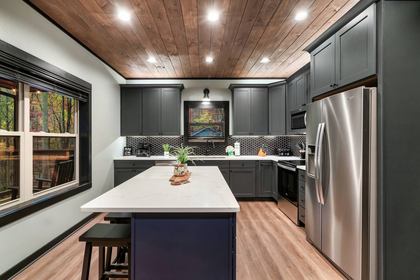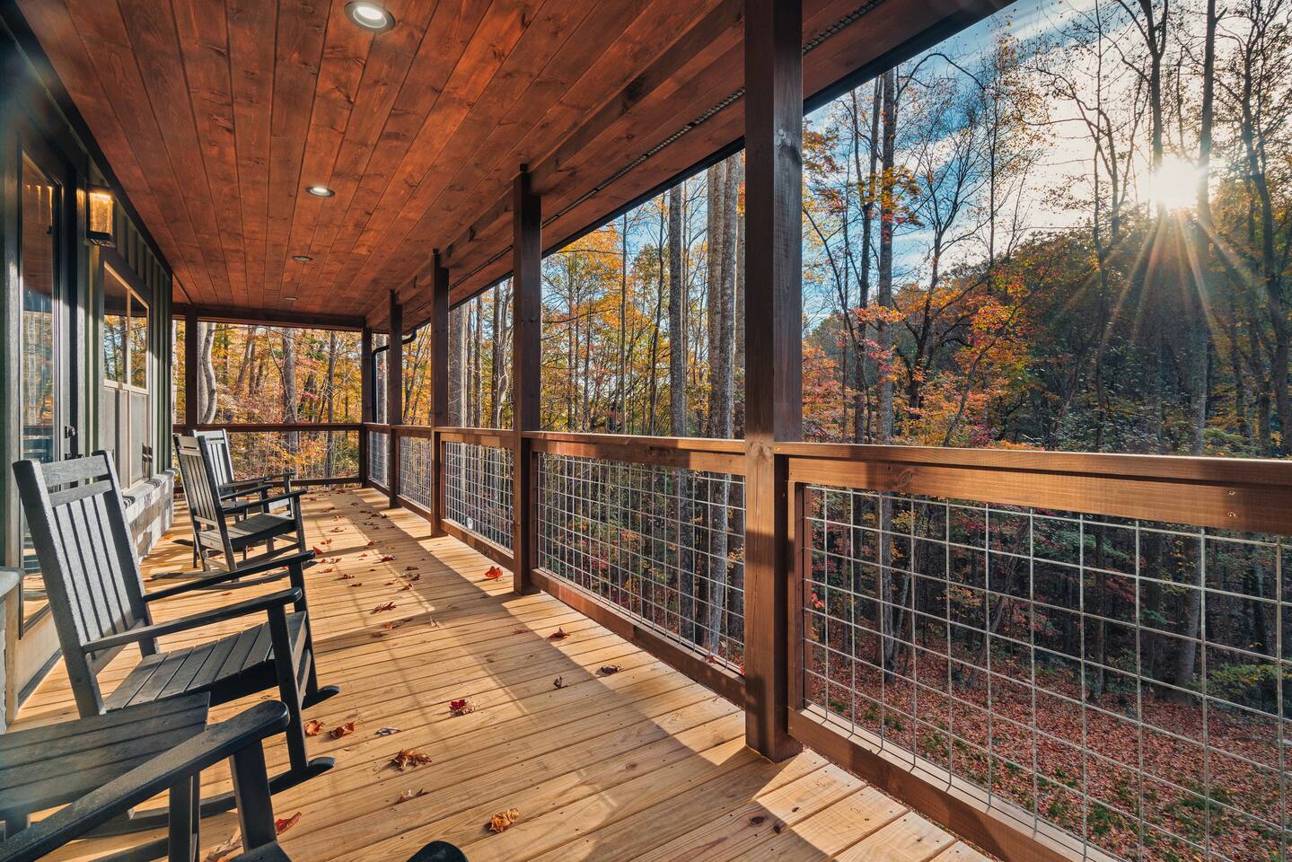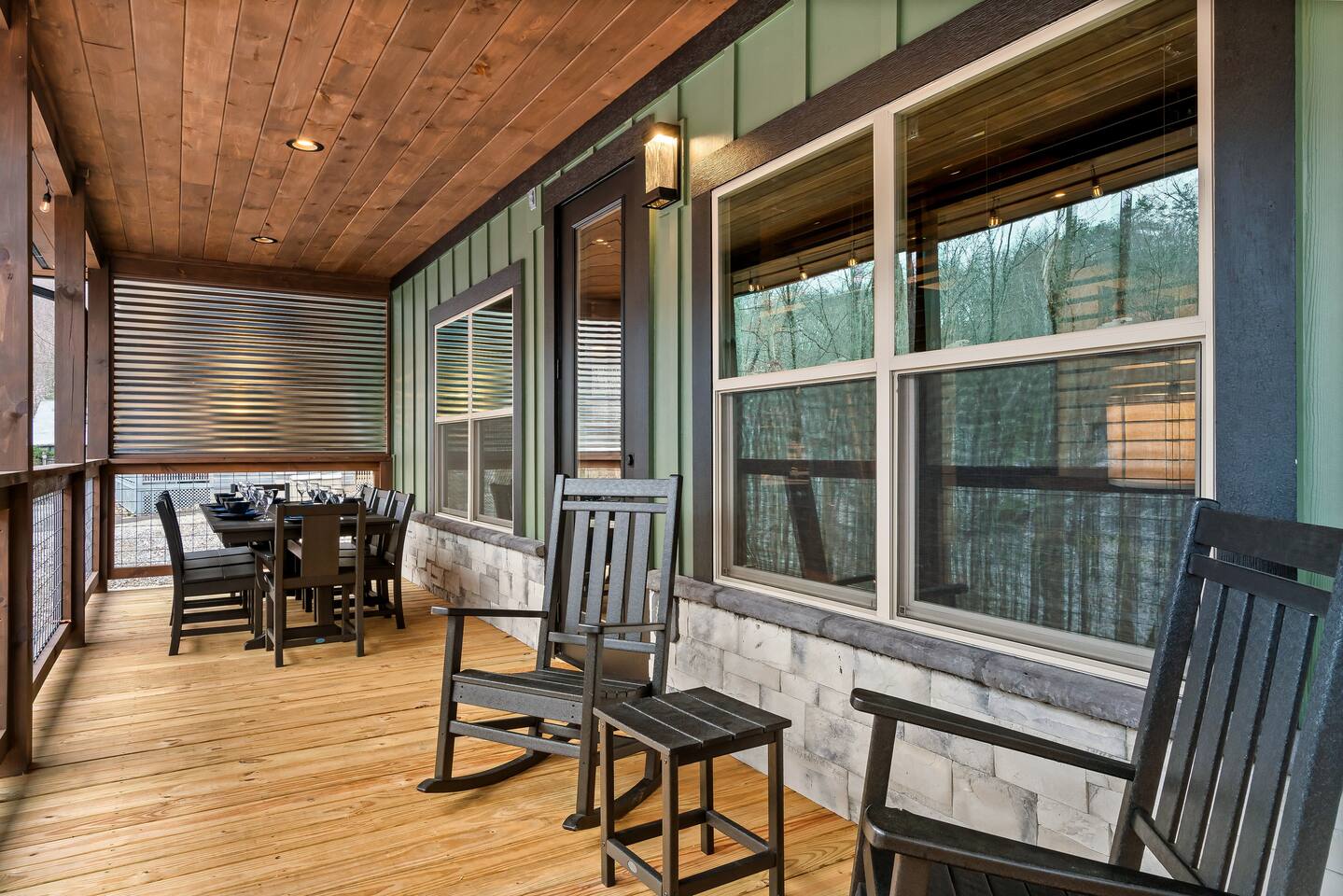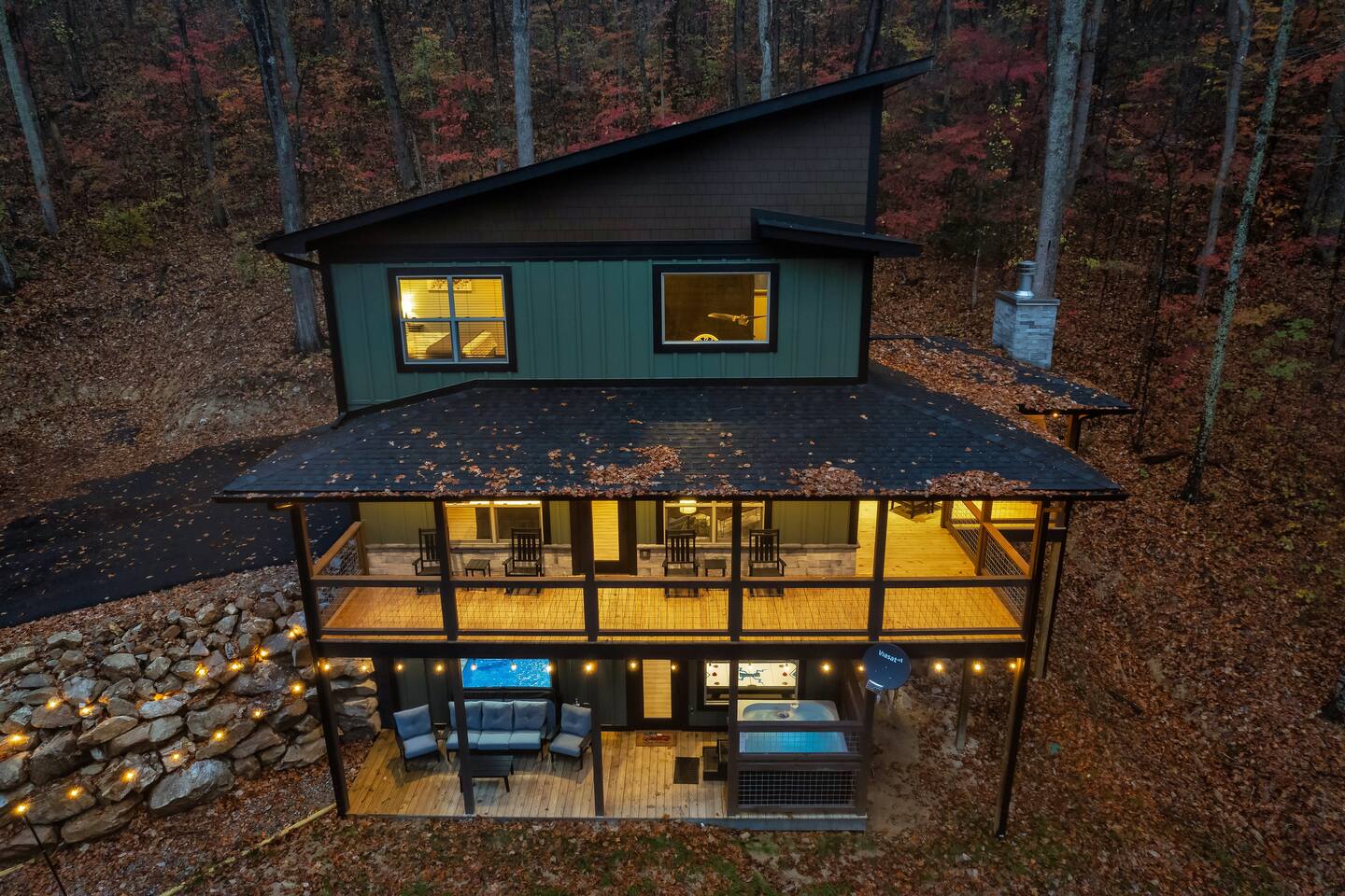 Welcome to Bluff Mountain Retreat - Our newly constructed modern cabin, nestled on a serene 2-acre wooded lot in Sevierville, Tennessee. Located less than 5 miles from the heart of Pigeon Forge, this retreat strikes the perfect balance—close enough to enjoy all the action, yet far enough away to provide a peaceful, quiet escape. The cabin features three spacious bedrooms, each with king beds and en suite baths. The main level bedroom is designed for accessibility, making it suitable for everyone. Additionally, there are two pull-out sofas, one on the main floor and one on the bottom floor, conveniently located next to the air hockey game and arcade game table, providing extra sleeping space and entertainment options. A spacious laundry room is conveniently located on the top level. Enjoy the indoor pool on the bottom level and unwind in the outdoor hot tub, which is situated near the fire pit. The outdoor living area offers a cozy setting for relaxation with its owner fireplace and big screen TV. The cabin is equipped with six smart televisions located throughout the house for your entertainment needs. The property includes Wi-Fi to keep you connected during your stay. For added convenience, the cabin features an electric vehicle charger and is just 6 miles from Kroger and Publix grocery stores. The nearest gas station and Whaley's Country Store are both located just 2.5 miles away, making it easy to meet any additional needs during your visit. Large windows in every room allow natural light to fill the space and offer stunning views of the beautiful surroundings. Whether you are looking to explore the Great Smoky Mountains or simply relax in a tranquil setting, our cabin is the ideal destination for your next getaway. *10 miles to Dollywood *6 miles to The Island In Pigeon Forge *7 miles to The Titanic Museum In Pigeon Forge *12.5 miles to the Gatlinburg Welcome Center *15 miles to Anakeesta *15 miles to Ripley's Aquarium of the Smokies *17 Miles to Ober Mountain - Large, heated indoor pool with giant Baja Shelf for kids to play - Brand new, 4-person hot tub - Real wood-burning fireplace outside and electric fireplace inside - Giant, wood-burning fire pit just off the lower deck We can't wait for you to call Bluff Mountain Retreat home!